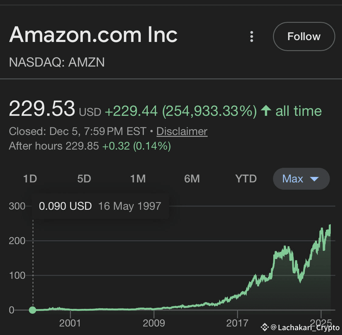 In a tweet, 24hrscrypto1, a widely followed XRP commentator, highlighted Amazon’s historical chart, showing its rise from $0.09 in 1997 to more than $229 over time. Notably, the chart shows that Amazon’s stock has risen 254,933% during its lifetime.