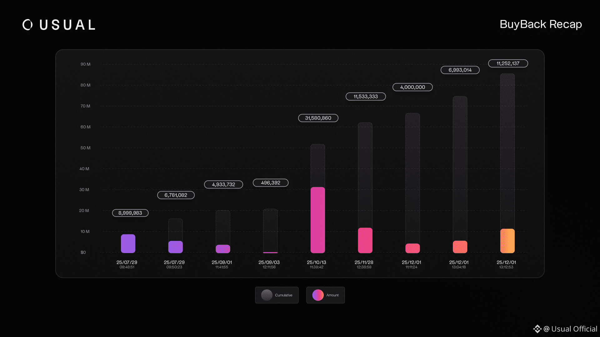 Across sixteen weeks, approximately $4.7 million was deployed through the buyback program, resulting in 86.5 million USUAL acquired. These figures reflect completed buybacks during the period. Any USUAL that remains temporarily on centralized exchanges is not included in these totals and will be reflected once transferred.