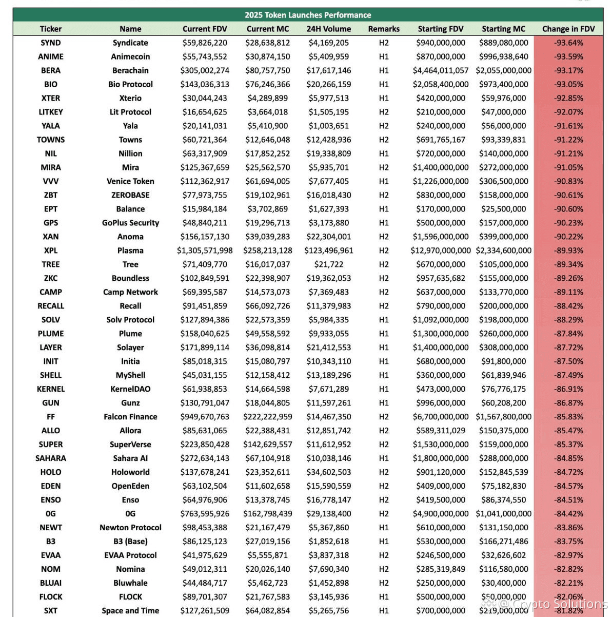 The idea that a high FDV signals quality has quietly died here. Strong teams, big backers, and popular sectors didn’t prevent deep drawdowns. Valuation became a marketing tool rather than a reflection of value, and once price discovery began, those inflated expectations collapsed under their own weight.