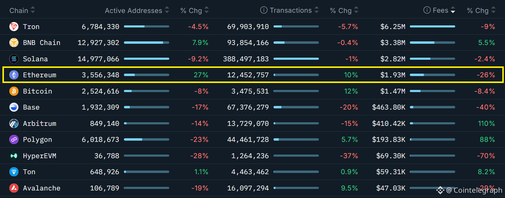 By comparison, transactions on BNB Chain and Solana were largely flat over the same seven-day window. To determine whether demand for Ether remains solid, it is necessary to assess the effective usage of DApps on the network.