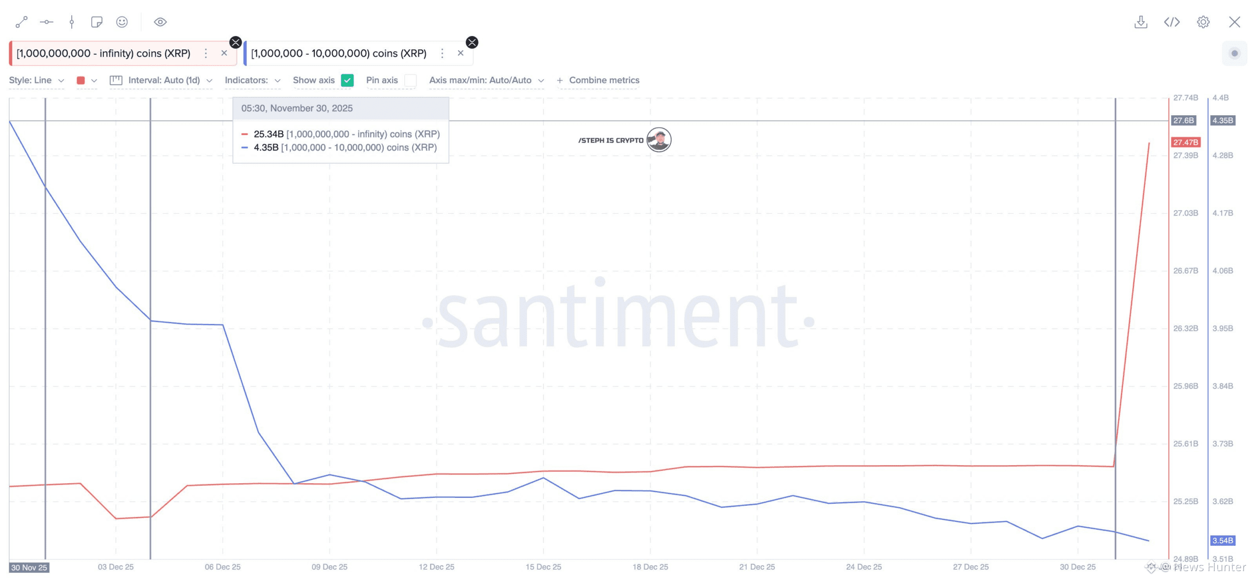 Mega whales holding more than 1 billion coins have aggressively accumulated XRP worth approximately $3.6 billion in the last 24 hours, according to data by on-chain analytics platform Santiment.