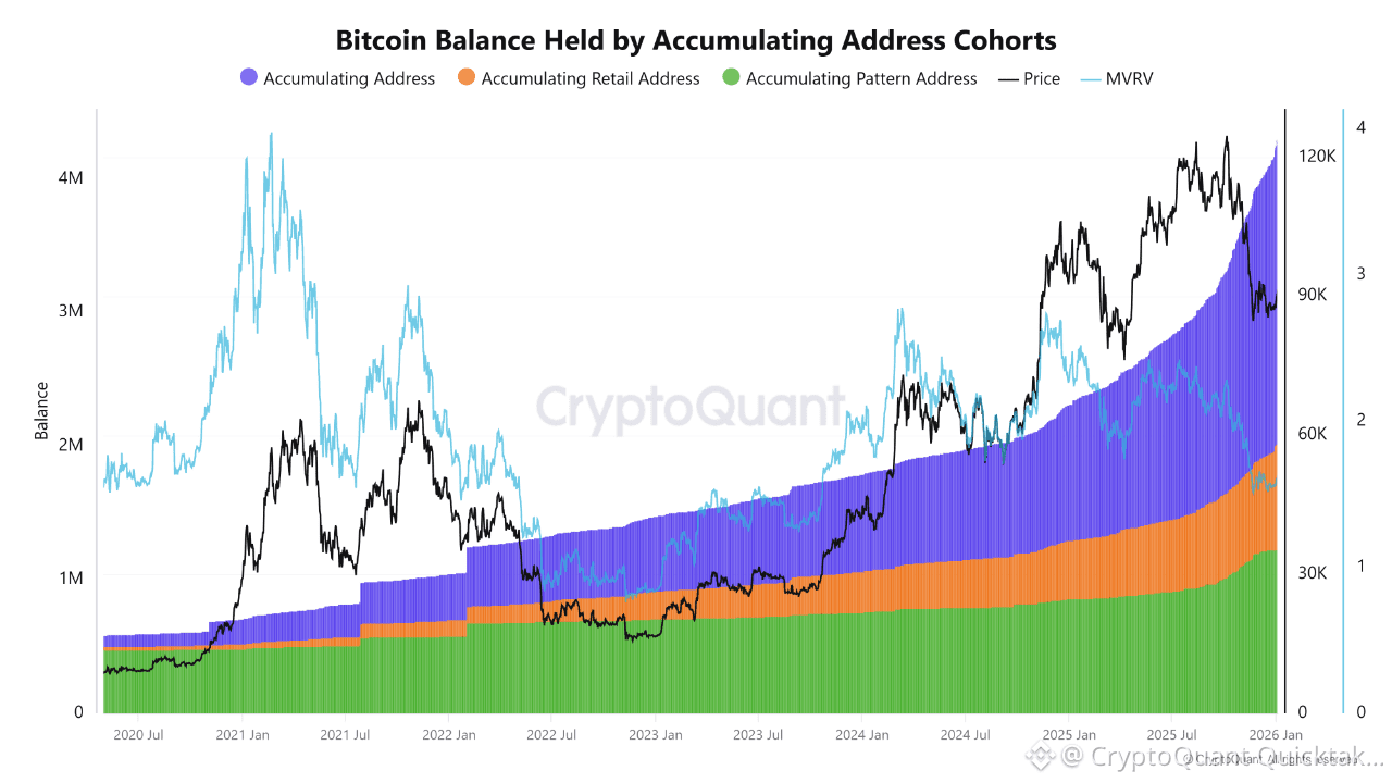 Retail accumulating addresses (orange) are also trending higher, though at a more measured pace. This indicates growing participation from smaller holders without the signs of euphoric inflows typically observed near cycle tops. Meanwhile, accumulating pattern addresses (green) continue their steady expansion, reinforcing the view that systematic and strategic accumulation remains dominant across market participants.