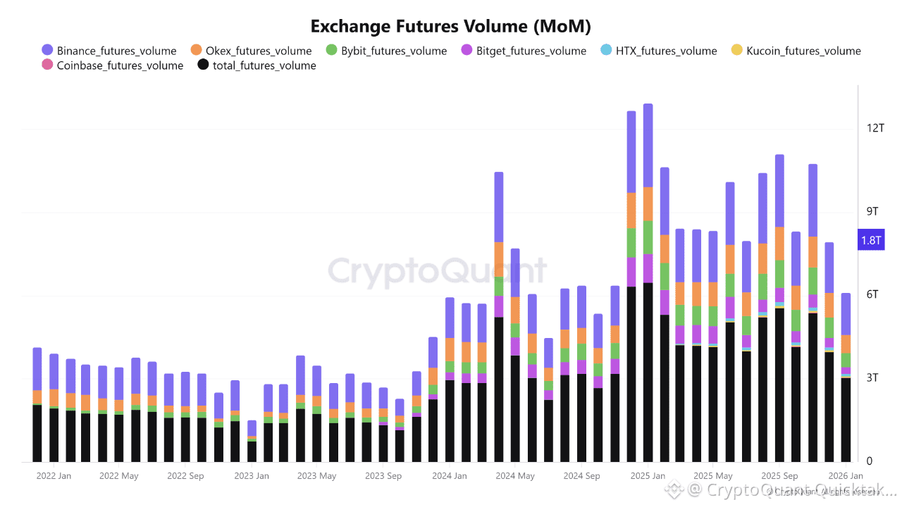 Futures volume hit $3.06 trillion in December. That's down 52.8% from where we were at the December 2024 peak. Pretty brutal. But dig into the numbers and you'll notice something odd—futures only dropped 23.1% month-over-month while spot absolutely tanked at 35.5%. That 12-point gap? It's showing us exactly who stayed and who packed up.