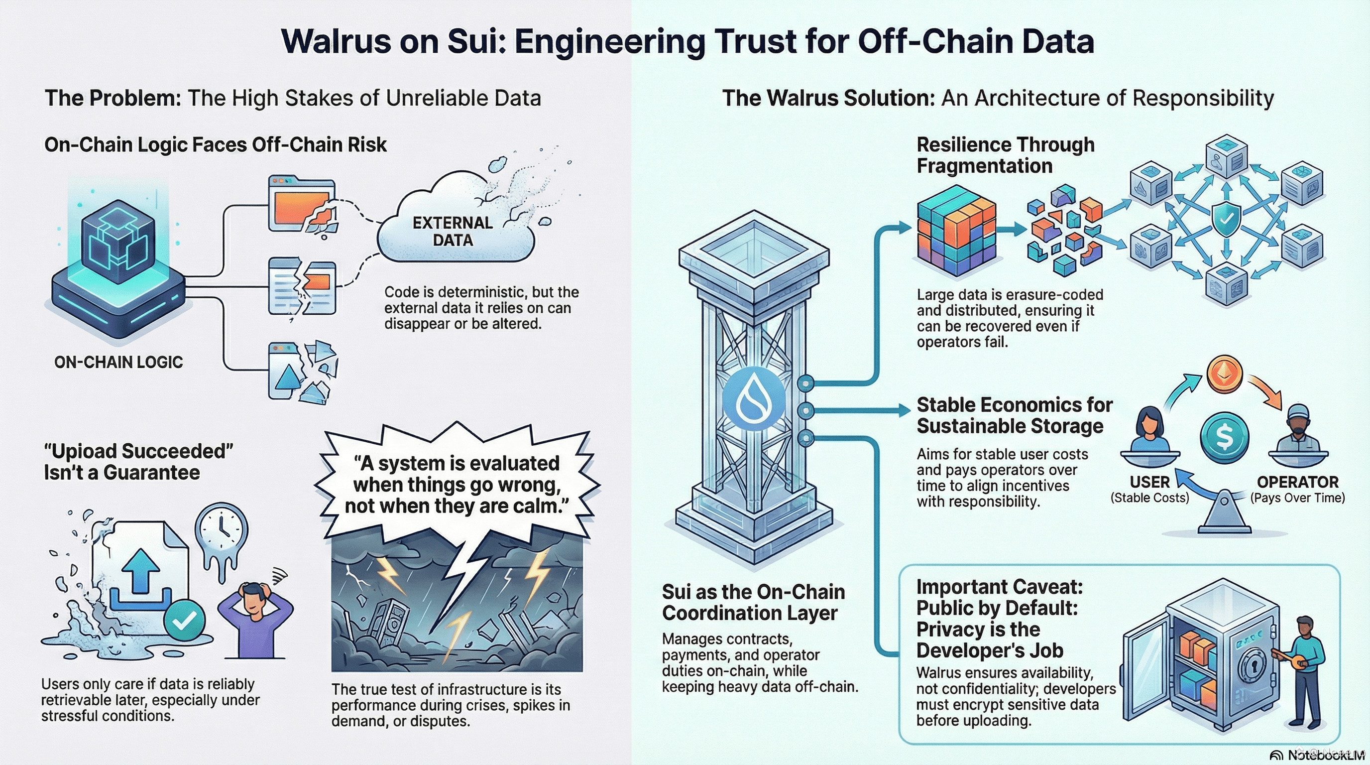 In the end, the most honest way to describe Walrus is not as a place to put files, but as a way to reduce the emotional cost of depending on data that lives outside the chain. The projectâs choicesâanchoring responsibility on Sui, engineering recoverability into the storage path, admitting public-by-default truths, paying operators over time, inviting adversarial testingâare all different expressions of the same ethic. Itâs infrastructure built for the moments when things go wrong, when people are tired, when markets are loud, and when confidence is fragile.