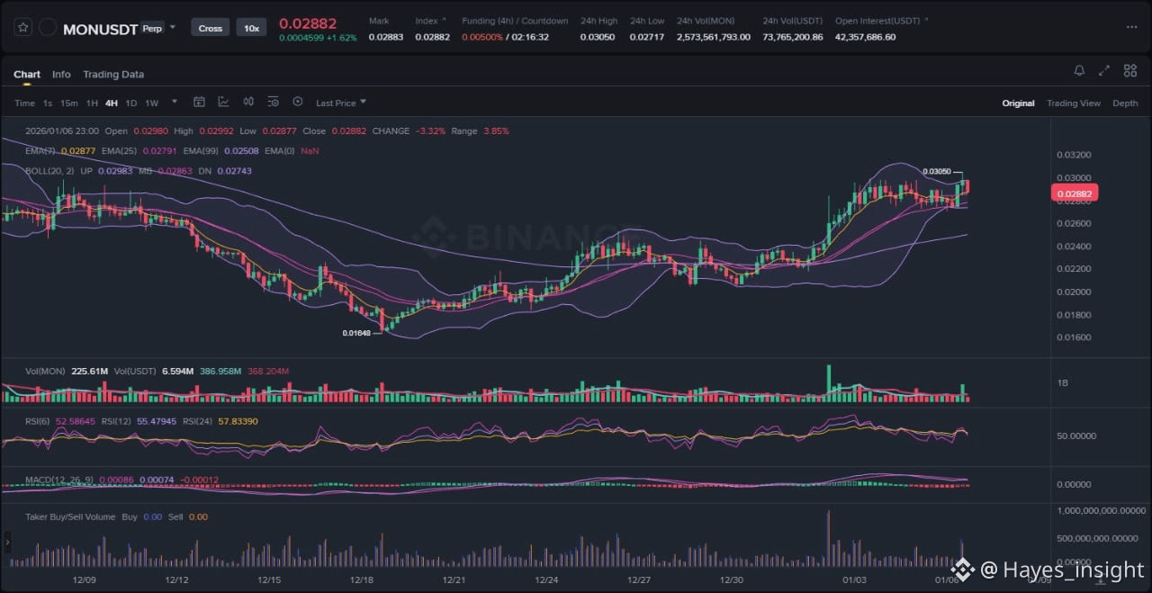 For continuation of the uptrend, MON price must demonstrate sustained buying conviction by closing above the $0.027 resistance on elevated volume, ideally forming higher lows above the 25 EMA to confirm the impulsive structure. A retest of the $0.026 liquidity pocket as support would further validate this, potentially leading to a volatility expansion toward the prior swing high zone. Momentum indicators should remain constructive, with RSI holding above 60 and MACD histogram bars widening, signaling no immediate mean reversion.