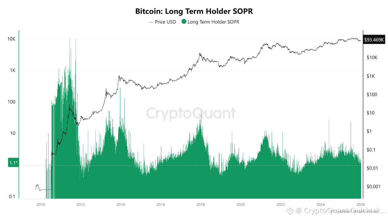 One of the key indicators used in on-chain analysis is Long Term Holder SOPR. This metric shows whether long-term holders are selling their assets at a profit or at a loss. Values above 1 indicate profit-taking, while values below 1 suggest capitulation or loss-driven selling. When Long Term Holder SOPR remains stable, it implies that long-term holders are sitting on unrealized gains but are not actively selling, keeping structural selling pressure low.