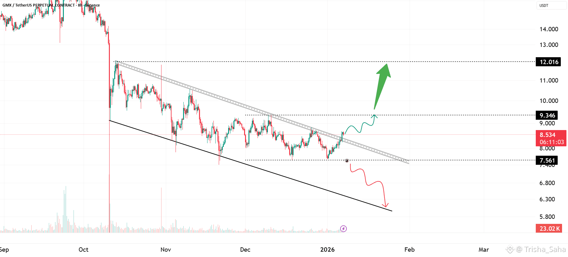 GMX is trading inside a well-defined descending channel, marked by consistent lower highs and lower lows. Price action remains technically bearish, but momentum has slowed as price approaches the upper boundary of the channel.