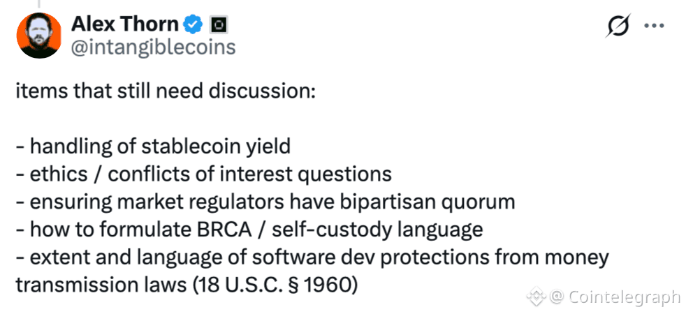 Others are less optimistic of it happening so soon. Galaxy Digital head of research Alex Thorn said in an X post on Tuesday that after reviewing a document from a bipartisan Senate meeting on Tuesday, it is “unclear if the two sides can come together and make that bipartisan as plenty of issues are still outstanding.”