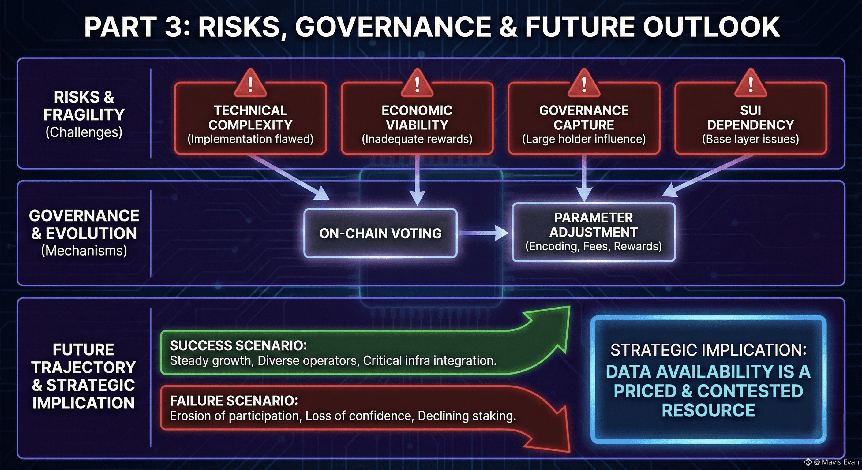 Governance presents another layer of fragility. Parameter changes that appear rational in isolation can have unintended second-order effects when applied at scale. Increasing encoding ratios to improve fault tolerance, for example, raises storage costs and may discourage usage. Conversely, optimizing for cost efficiency could reduce resilience. Governance capture is a further concern, particularly if large stakeholders accumulate disproportionate influence over protocol evolution. While on-chain voting provides transparency, it does not eliminate the risk of decisions that favor capital over long-term network health.