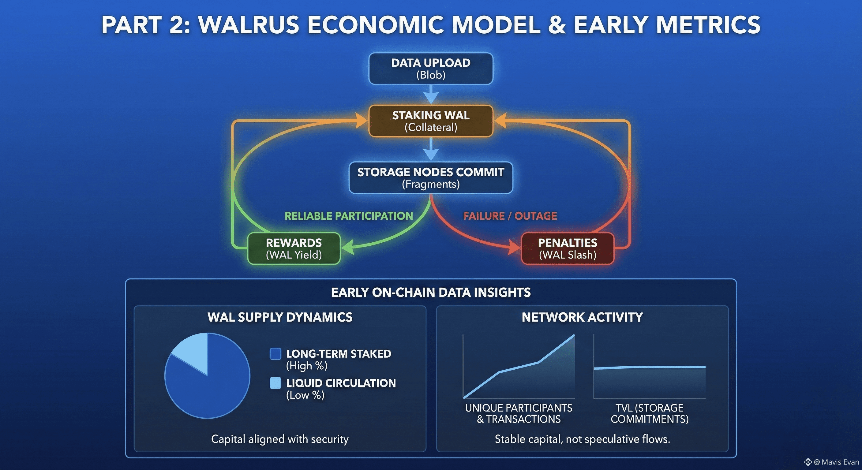 This architectural choice has direct economic consequences. By reducing the amount of raw storage required per unit of usable data, Walrus lowers the marginal cost of availability. That reduction changes the incentive landscape for both storage providers and users. Providers are not paid for holding redundant copies indefinitely but for participating in a network that maintains recoverability under defined conditions. Users, in turn, pay for guarantees rather than excess capacity. The WAL token sits at the center of this system, functioning as the medium through which storage commitments, staking, and governance are coordinated. Token utility is not limited to fee payment. It is embedded in the security model, as storage nodes are required to stake WAL to participate, aligning their economic exposure with the integrity of the data they help secure.