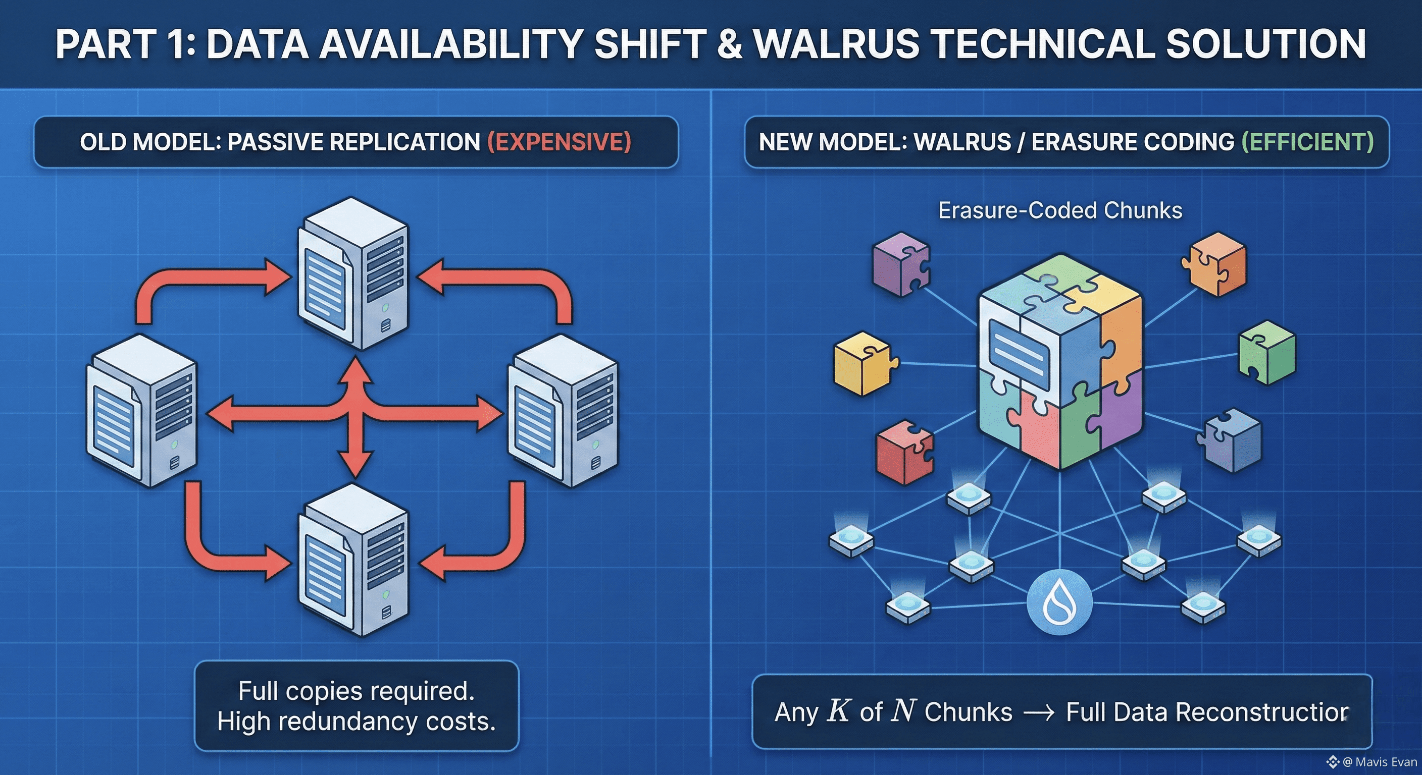 @Walrus 🦭/acc is often introduced as a decentralized storage protocol, but that framing undersells its intent. At a deeper level, it is an attempt to re-architect how large-scale data is handled in blockchain systems that demand both availability and verifiability under economic stress. Built on the Sui blockchain, Walrus leverages a combination of erasure coding and blob-based storage to distribute data across a decentralized network in a way that minimizes redundancy costs while preserving fault tolerance. This design choice is not cosmetic. Traditional decentralized storage systems rely heavily on replication, which is simple to reason about but expensive at scale. Walrus instead treats data as something that can be mathematically reconstructed even when large portions of the network are unavailable or adversarial, shifting the security model from brute-force duplication to probabilistic guarantees grounded in coding theory.