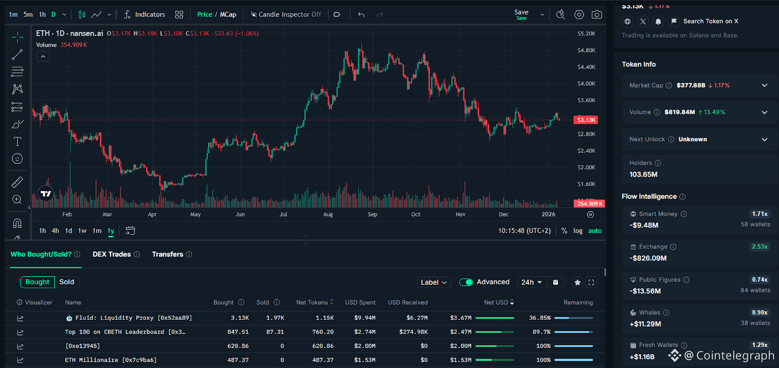 Whales bought $11.2 million Ether across 38 wallets during the past week, while fresh wallets bought a cumulative $1.16 billion. However, smart money traders have offloaded $9.48 million during the same period, according to Nansen.
