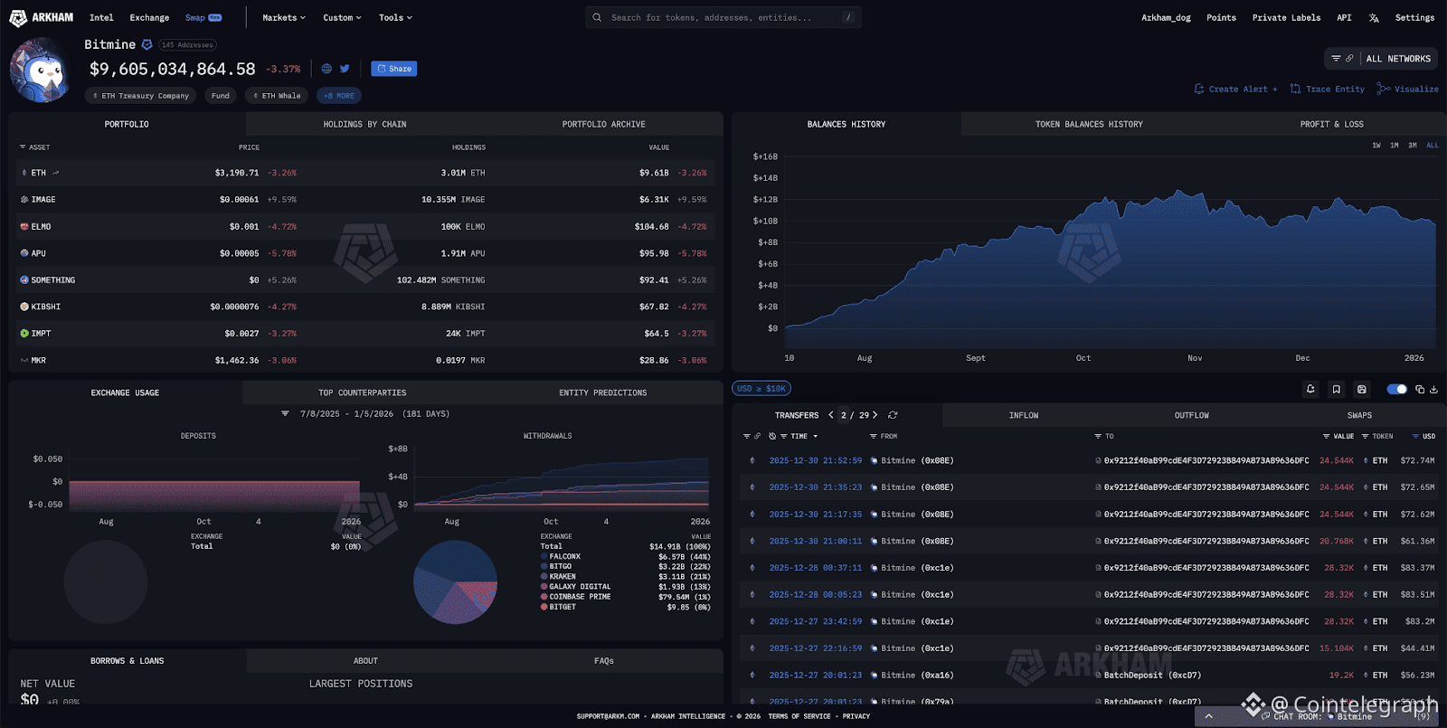 BitMine bought $105 million worth of Ether (ETH) in its first reported acquisitions of the new year, according to a Wednesday X post from blockchain data platform Arkham.