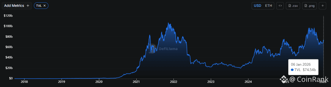 Recent on-chain data confirms a renewed concentration of decentralized finance activity on Ethereum, reinforcing its role as the primary settlement layer for on-chain financial markets. According to DeFiLlama, Ethereum’s DeFi total value locked (TVL) stands at over USD 70 billion, accounting for approximately 65–70% of total DeFi TVL across public blockchains, depending on the measurement window.