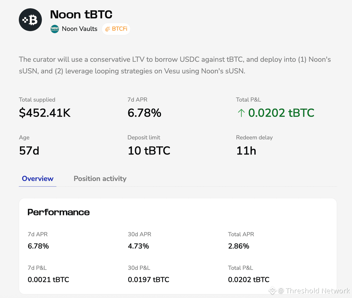 Integrating tBTC into Noon’s vault framework reflects a broader evolution in how Bitcoin is used onchain. The structure enables BTC holders to maintain Bitcoin exposure while engaging with BTC-denominated strategies implemented under defined risk parameters and transparent infrastructure.