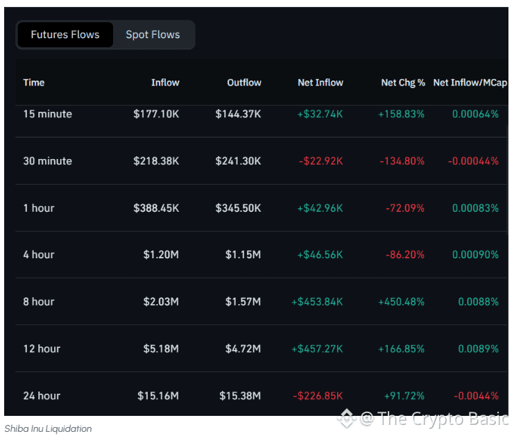 On a larger scale, the 1-hour, 4-hour, and 8-hour periods show consistent positive inflows, particularly the 8-hour timeframe, which recorded $453.84K in net inflows (+450.48%). This indicates growing interest in SHIB futures, suggesting confidence in the token’s price action over the medium term.