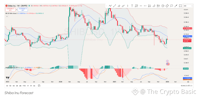 The latest weekly Shiba Inu price chart shows that the crypto is currently testing the middle Bollinger Band, which is a key support level. The middle band acts as the 20-period simple moving average, and its positioning around $0.00001006 has become a significant focal point for traders.
