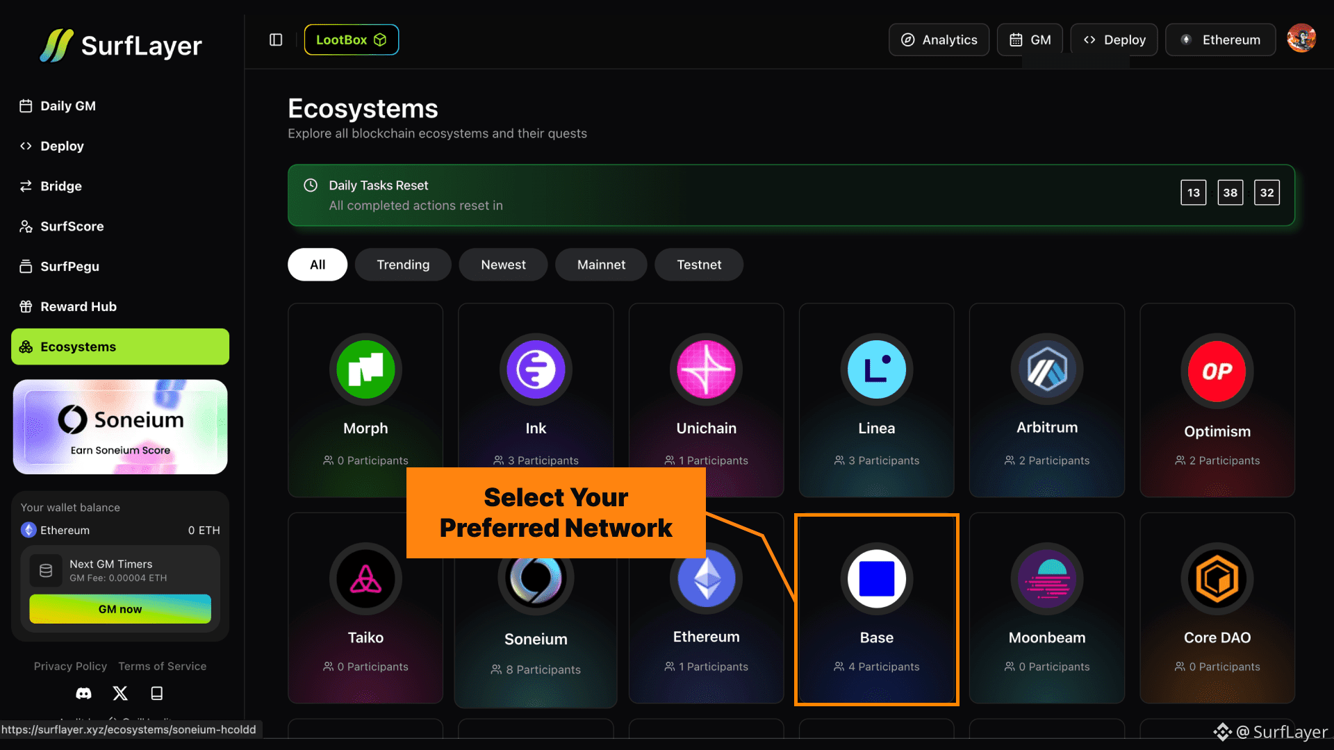 SurfLayer introduces the Ecosystem Quests system, designed to help users explore blockchain networks more effectively while building a verifiable on-chain identity. By transforming on-chain interactions into structured quests, users can take their first steps on a network with clarity, consistency, and additional SurfPoint rewards.
