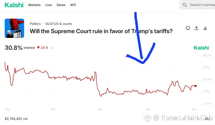 Markets currently price ~70% probability that the tariffs get overturned, with only ~30% odds the court sides with Trump.