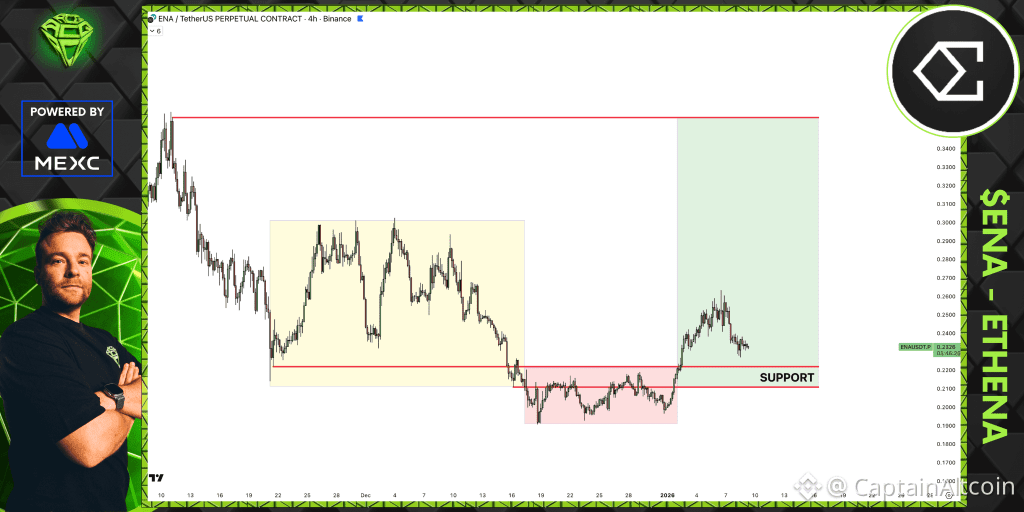 The support zone in the low-$0.22 area is the level that matters most right now. It’s where resistance turned into support after the rebound, and it’s acting as the line in the sand. As long as ENA keeps holding above this level, the setup stays intact.