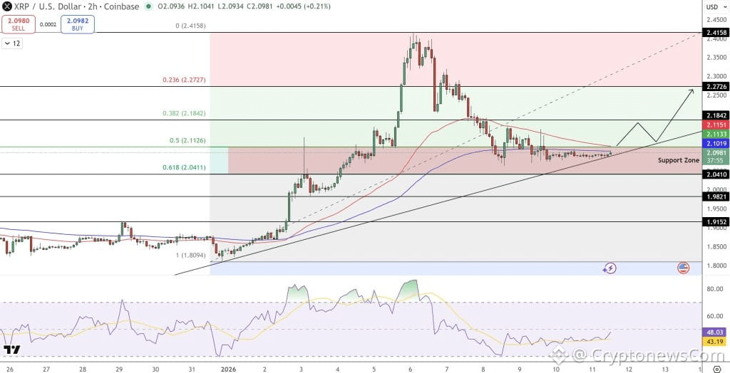 Using TradingView’s path projection, a decisive break above $2.15 would likely open the door toward $2.27, followed by a potential retest of $2.40 if momentum builds. As long as XRP holds above rising trend support, the broader setup favors continuation rather than distribution.
