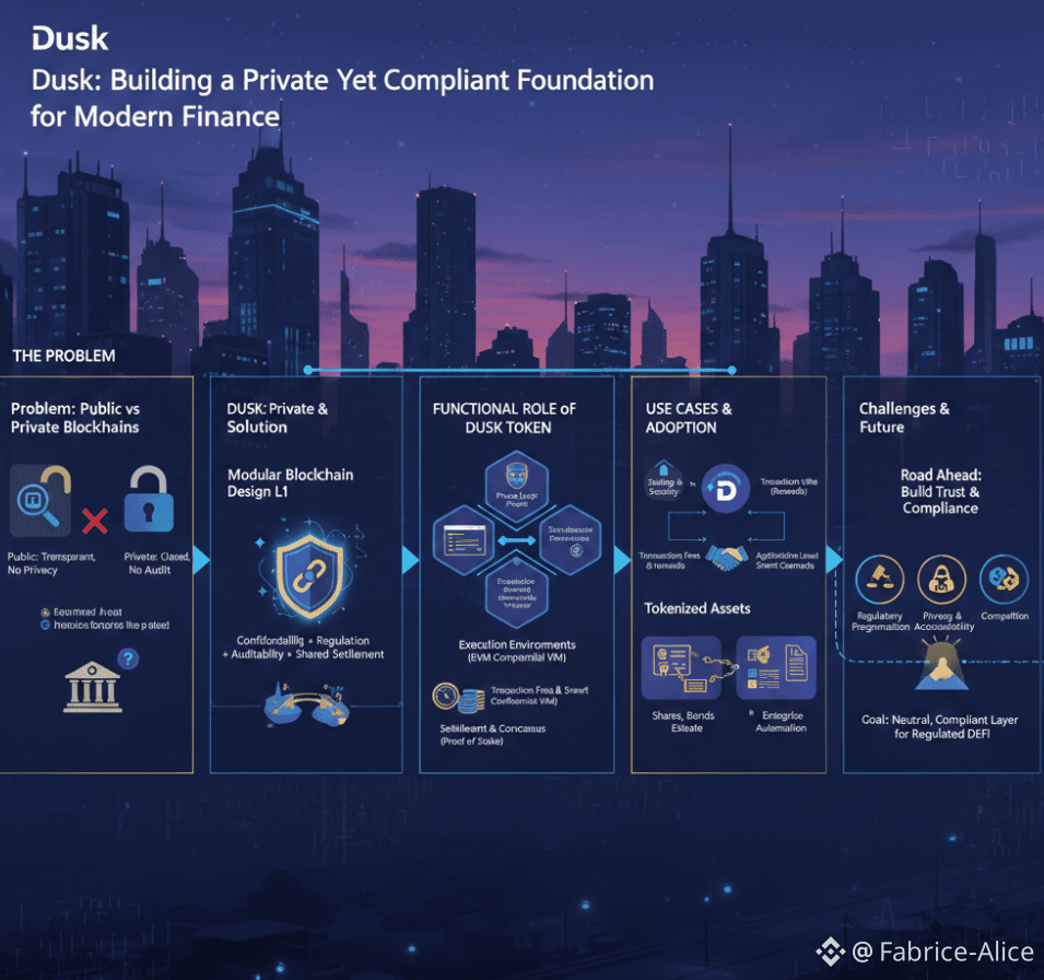 @Dusk is a Layer 1 blockchain developed to address a fundamental limitation in existing blockchain systems. Most networks fall into one of two extremes: they are either fully public and transparent, or entirely private and restricted. Regulated financial environments, however, require a middle ground. Financial institutions, asset issuers, and banks cannot operate on blockchains where all transactions and balances are publicly visible, yet closed systems fail to provide the shared verification, auditability, and trust that open networks offer. Dusk was designed specifically to bridge this divide by delivering a public blockchain that supports privacy while remaining compatible with regulatory oversight and compliance requirements.