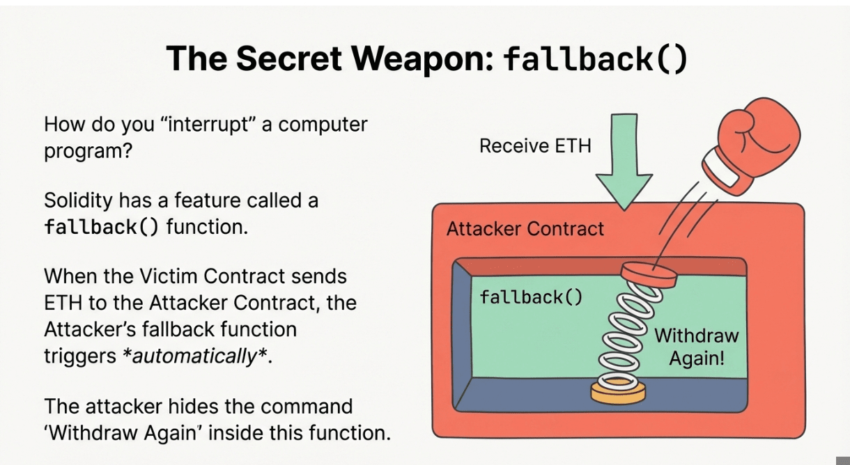 The Fallback Function: The "Interruption" happens because of a special feature in Solidity called a fallback() function. When the Victim Contract sends ETH to the Attacker Contract, the Attacker's fallback() function triggers automatically. The attacker hides the "Withdraw Again" command inside this function.
