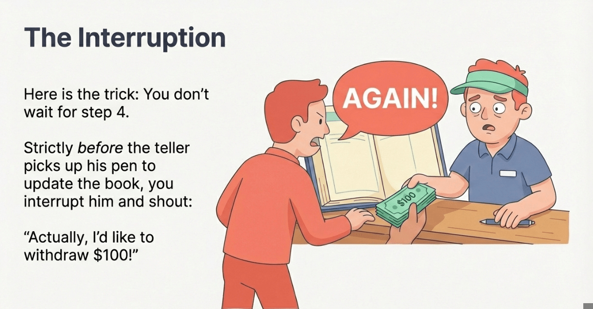 BUT, strictly before he picks up his pen to update your balance to $0, you interrupt him and shout: