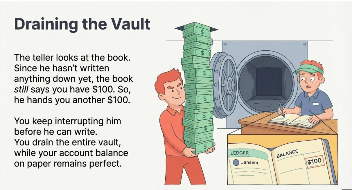 The Fix (Checks-Effects-Interactions): The way to stop this is simple but easy to forget. You must update the ledger before you send the money. If the teller writes "-$100" in the book before opening the cash drawer, the attack fails. This is called the "Checks-Effects-Interactions" pattern.