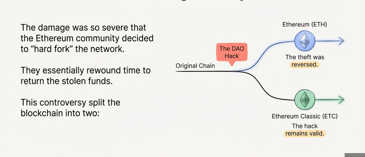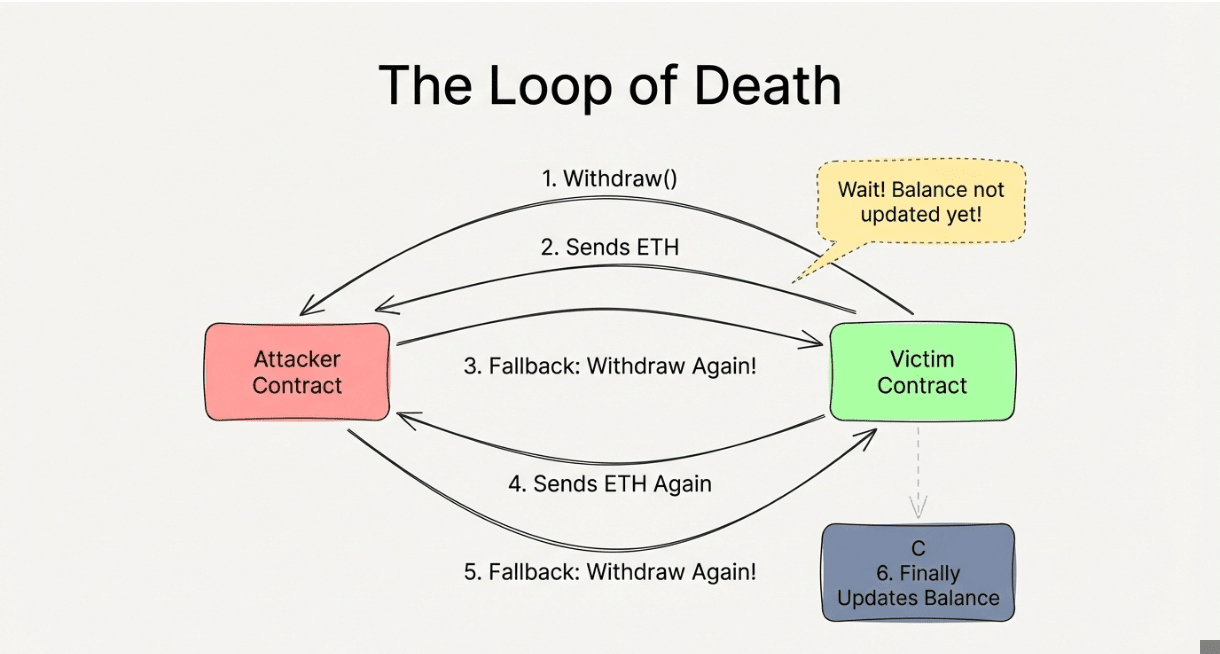 This is the specific hack that killed "The DAO" in 2016 (the first major crypto fund). It was so bad ($60 million stolen) that Ethereum had to "hard fork" (we already discussed about it) to fix it, which is why we have Ethereum (ETH) and Ethereum Classic (ETC) today. It is the grandfather of all smart contract exploits.