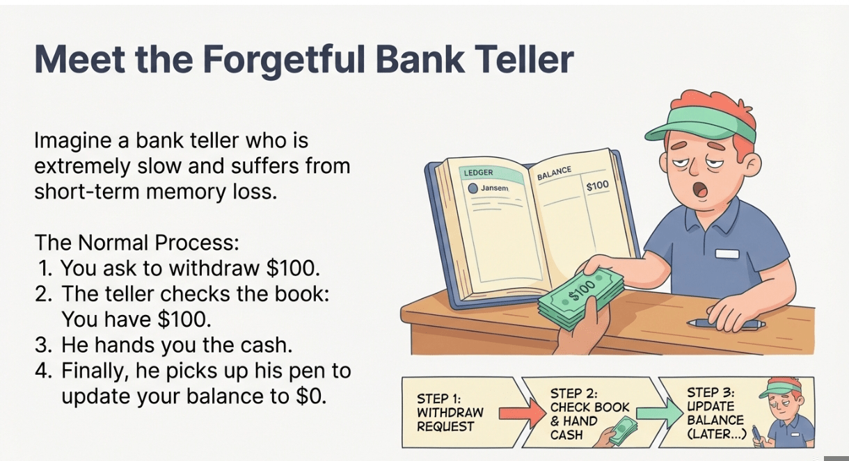 Bro, imagine you go to a bank where the teller is extremely slow and has short-term memory loss.