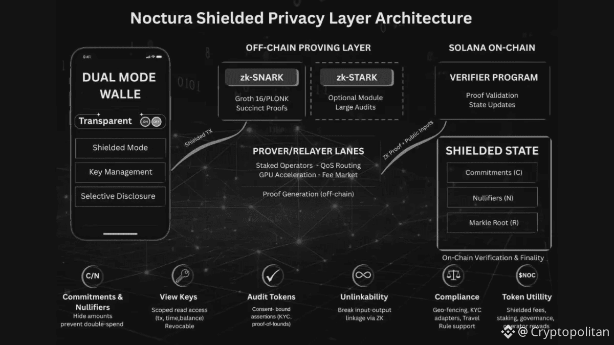 At the center is $NOC, the utility token powering Shielded Mode fees, prover/relayer incentives, staking, and governance—creating a direct, usage-driven flywheel as private activity grows. Noctura’s design posture emphasizes measured performance over hype, targeting hundreds of shielded TPS at launch with scaling via batching, aggregation, and GPU proving lanes.