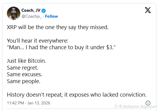 History shows that regret in investing follows a predictable script. Investors often recall moments when the price felt “too risky,” or narratives seemed unclear. Later, those same price levels appear trivial. Coach, JV suggests that XRP may soon become part of that recurring dialogue, where sub-$3 levels get remembered as missed entries rather than ongoing opportunities.