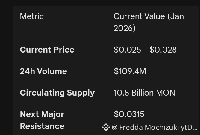 4. Strategic Entry Point: After hitting an All-Time High of $0.049 in late 2025, MON has stabilized in a strong accumulation zone between $0.023 and $0.028, forming a classic "cup and handle" pattern on the daily chart.