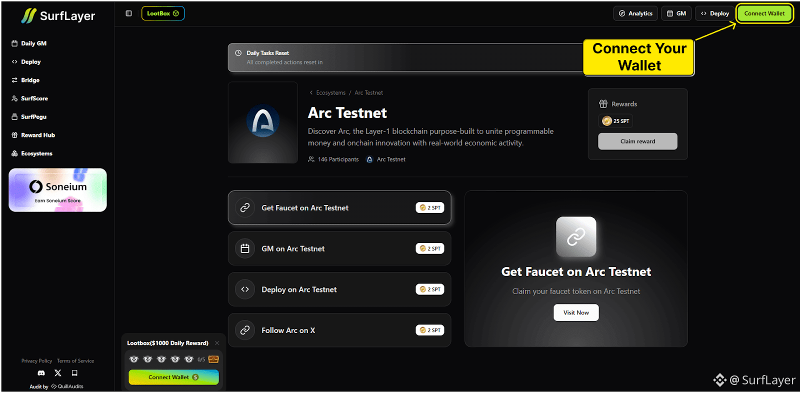 Step 1: Visit the ARC Testnet Quest at https://surflayer.xyz/ecosystems/arc-testnet-iq5cabย and connect your wallet.