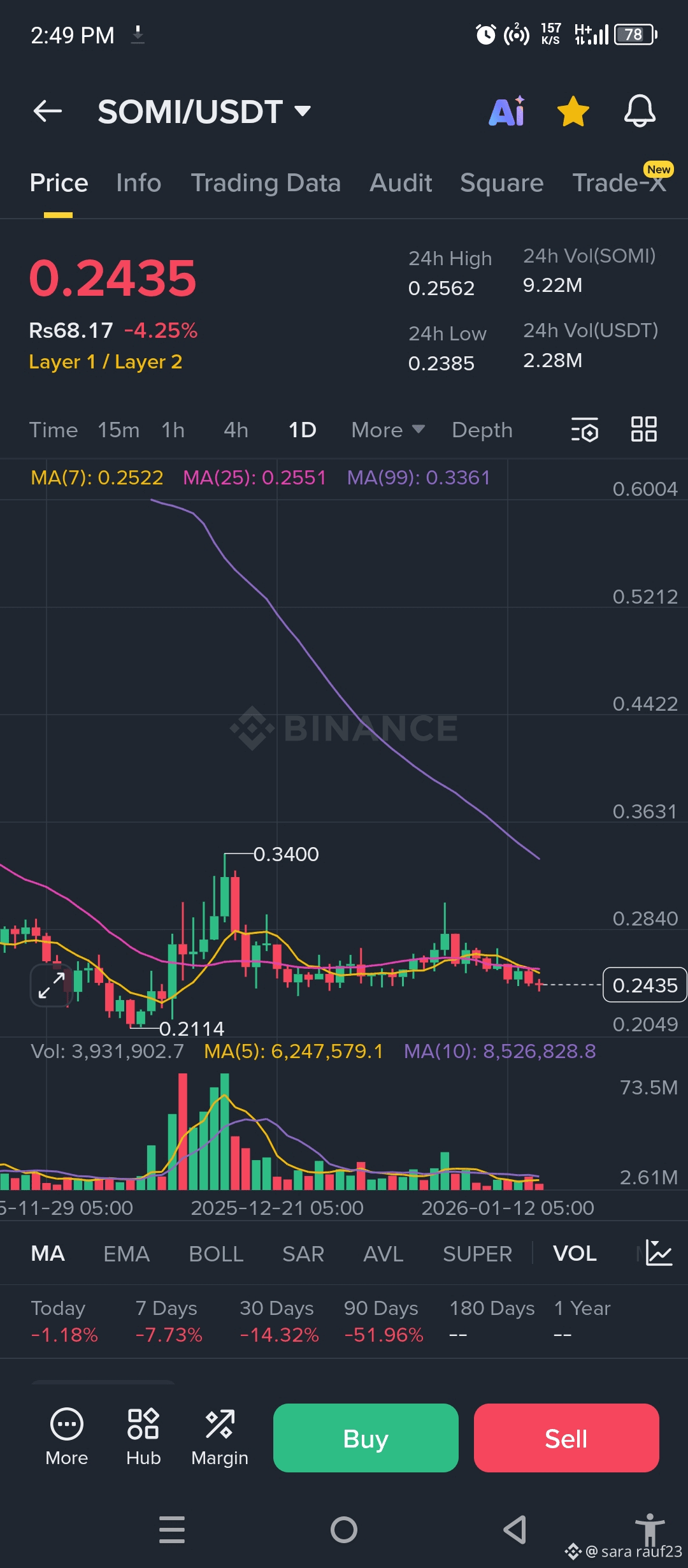 SOMI filhaal pressure mein hai aur daily timeframe par clear downtrend nazar aa raha hai. Price 0.24 USDT ke aas paas trade kar raha hai jo short-term moving averages se neeche hai ā yeh sellers ki strength show karta hai.