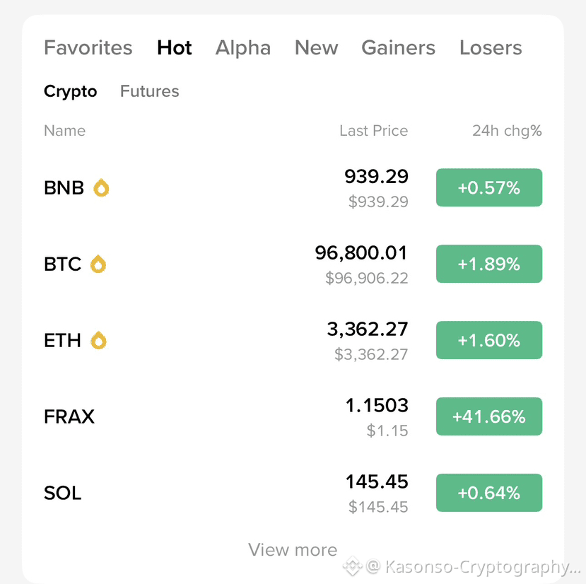 If you look on the market board now, big coins are green. BTC showing almost two percent up, ETH also moving good above three thousand three hundred, BNB holding strong near nine hundred plus, SOL also green. Even FRAX showing crazy move which shocked many traders. This clearly showing market is not dead as many people was shouting few days ago.