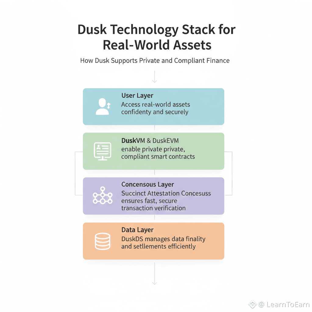 Dusk’s platform is not a simple adaptation of Ethereum or Bitcoin. Its architecture is purpose-built to support institutional-level finance while maintaining privacy and efficiency. Key components include: