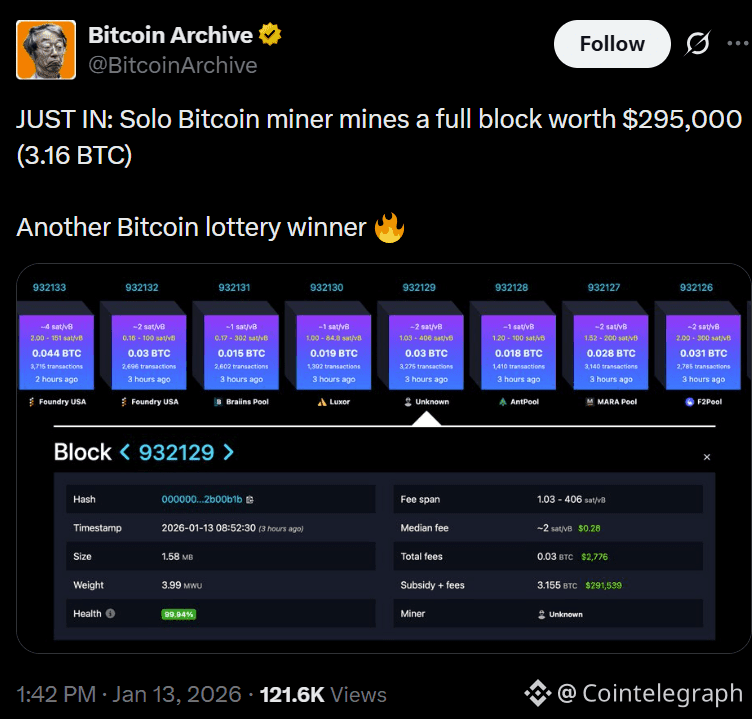 The brief “lucky miner” narrative also reignited discussion around solo mining, a setup in which an individual miner works independently rather than contributing hashpower to a pool. While solo miners receive the full block reward if successful, payouts are highly unpredictable due to the probabilistic nature of mining.