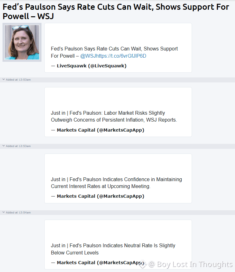 A Fed official, Paulson, has expressed support for Chair Powell and indicated that interest rate cuts are not urgent. He believes the risks from the labor market slightly outweigh concerns about persistent inflation and suggests the neutral interest rate is just below current levels, signaling confidence in holding rates steady at the upcoming meeting.