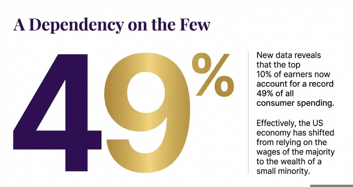 The structure of the American economy has undergone a dramatic transformation. For decades, the "US consumer" was synonymous with a broad, thriving middle class. Today, that narrative is mathematically obsolete. New data reveals that the top 10% of earners now account for a record 49% of all consumer spending, effectively making the US economy dependent on the wealth of a small minority rather than the wages of the majority.