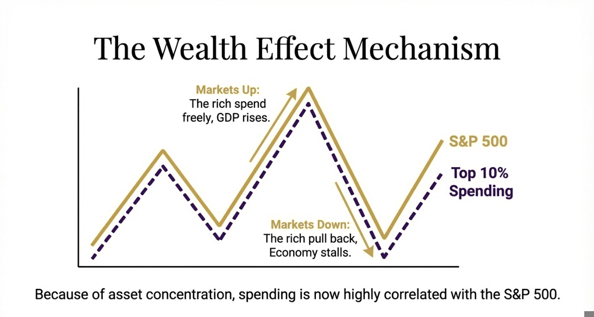 When markets fall, the "wealth effect" reverses, and the economy stalls. We have effectively built a system where the bottom 80% are just passengers, and the top 10% are the only ones with their hands on the wheel. Asset owners are the only winners; everyone else is just watching the game.
