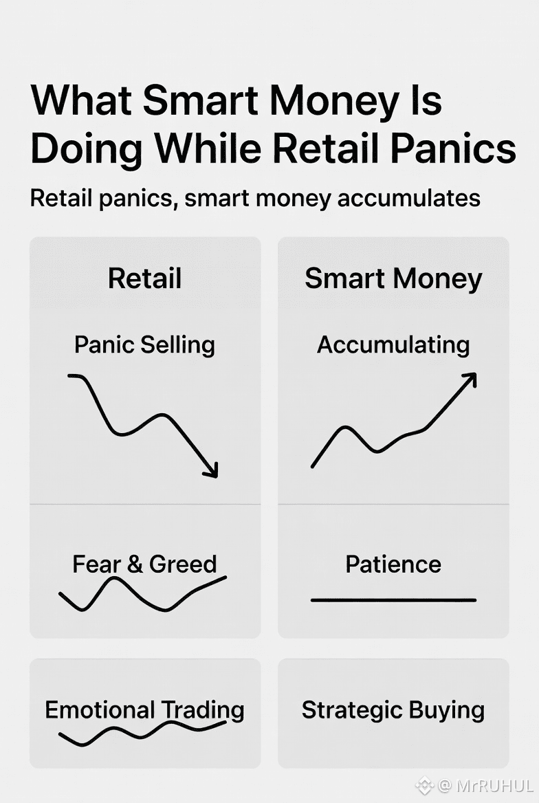 Retail panic is loud, fast, and emotional. Smart money stays quiet, patient, and behind the scenes. By the time the mood flips and everyone’s bullish again, their positions are already locked in.