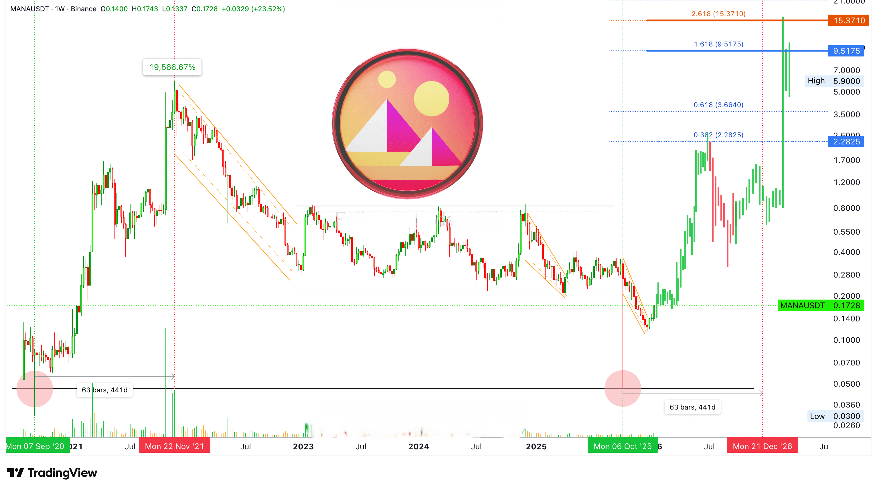 I have already explained how and why some projects are likely to decouple from the rest of the market and perform very well in 2026 and 2027. In short, it's because they performed poorly in 2025 and generally in the years following the last bull market. MANAUSDT grew by over 19,000% between September 2020 and November 2021.