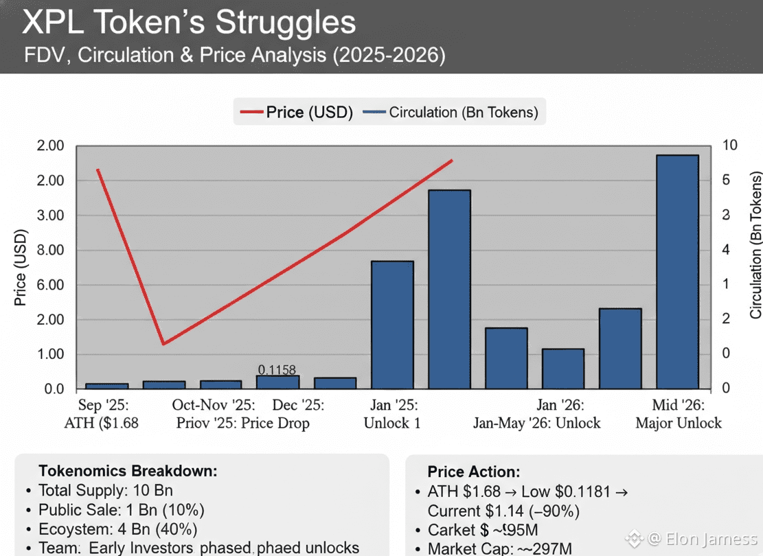 Looking at XPL’s price performance paints a clear picture. Back in late September, XPL reached an all-time high of $1.68. This price surge came during a period filled with positive news—being listed on major exchanges, new ecosystem partners joining the project, and a sharp increase in the total value locked (TVL) in the network. However, despite these optimistic signs, the price started to fall in October and continued its downward trend, eventually reaching a historic low of $0.1158 in mid-December 2025. Although the price has slightly recovered to $0.14, this rebound is very small compared to the massive 90% drop.