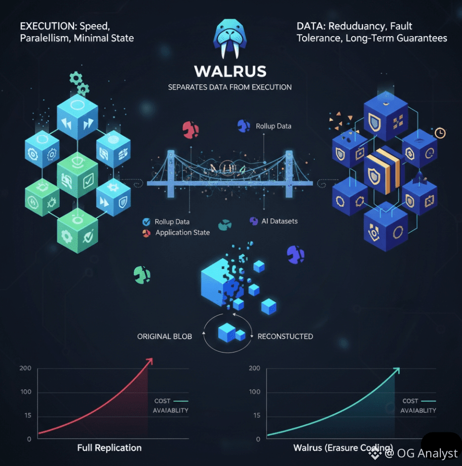 Walrus starts from a different premise. It treats data and execution as distinct responsibilities that should evolve independently. Execution is about validating state transitions. Data is about persistence, retrievability, and guarantees over time. Mixing the two creates friction, inefficiency, and unnecessary risk. Separating them creates room to scale.