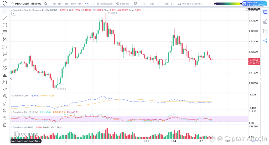 Looking at the 4-hour chart, HBAR recently slipped back below its 7-day moving average near $0.119. That level had been acting as a short-term floor, and once it gave way, price eased lower rather than snapping back. It’s a small move, but it shows sellers are still showing up whenever HBAR tries to push higher.
