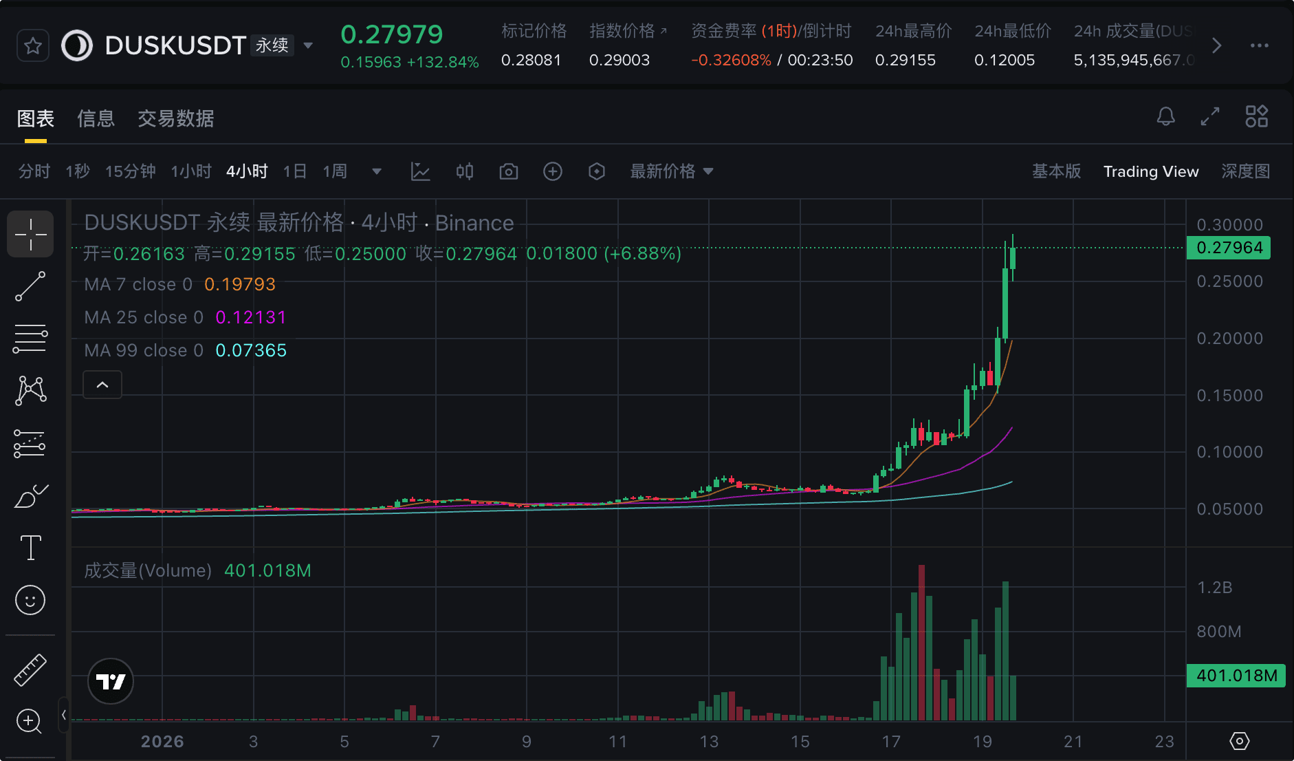 Risk Point: The price (0.267) is seriously deviating from MA99, with an excessive divergence rate. Although there is a short-term squeeze momentum, from a technical perspective, such vertical surges (Parabolic Run) are usually unsustainable, and a sharp pullback is inevitably needed to correct the moving average divergence.