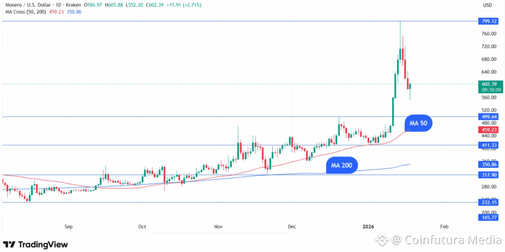 Despite falling 26% from its peak, Monero remains above key technical support levels. At the time of reporting, Monero traded at $590, down 5.98% in the past 24 hours, though it retained a 19% weekly gain. The token continues to trade above its 50-day and 200-day moving averages, positioned at $349 and $455 respectively. These levels had been converted into support following a major golden cross pattern in November, signaling continued bullish momentum.