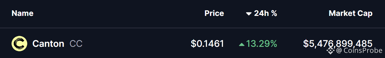 Canton Coin (CC), the native utility token of the Canton Network — a privacy-enabled public Layer-1 blockchain — is quietly stepping into the spotlight. While the broader crypto market remains under pressure, $CC is flashing relative strength, posting an impressive 13% daily gain and standing out among largely red charts.